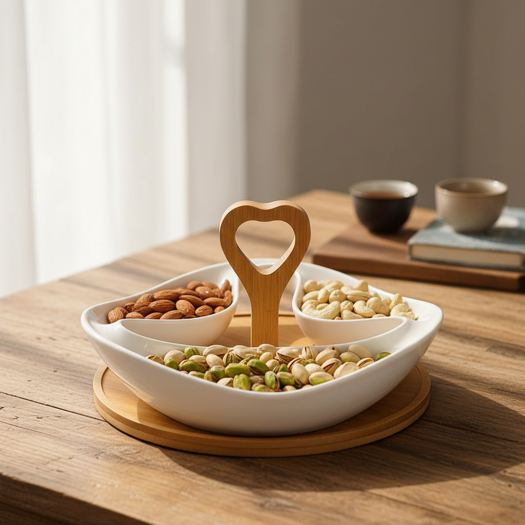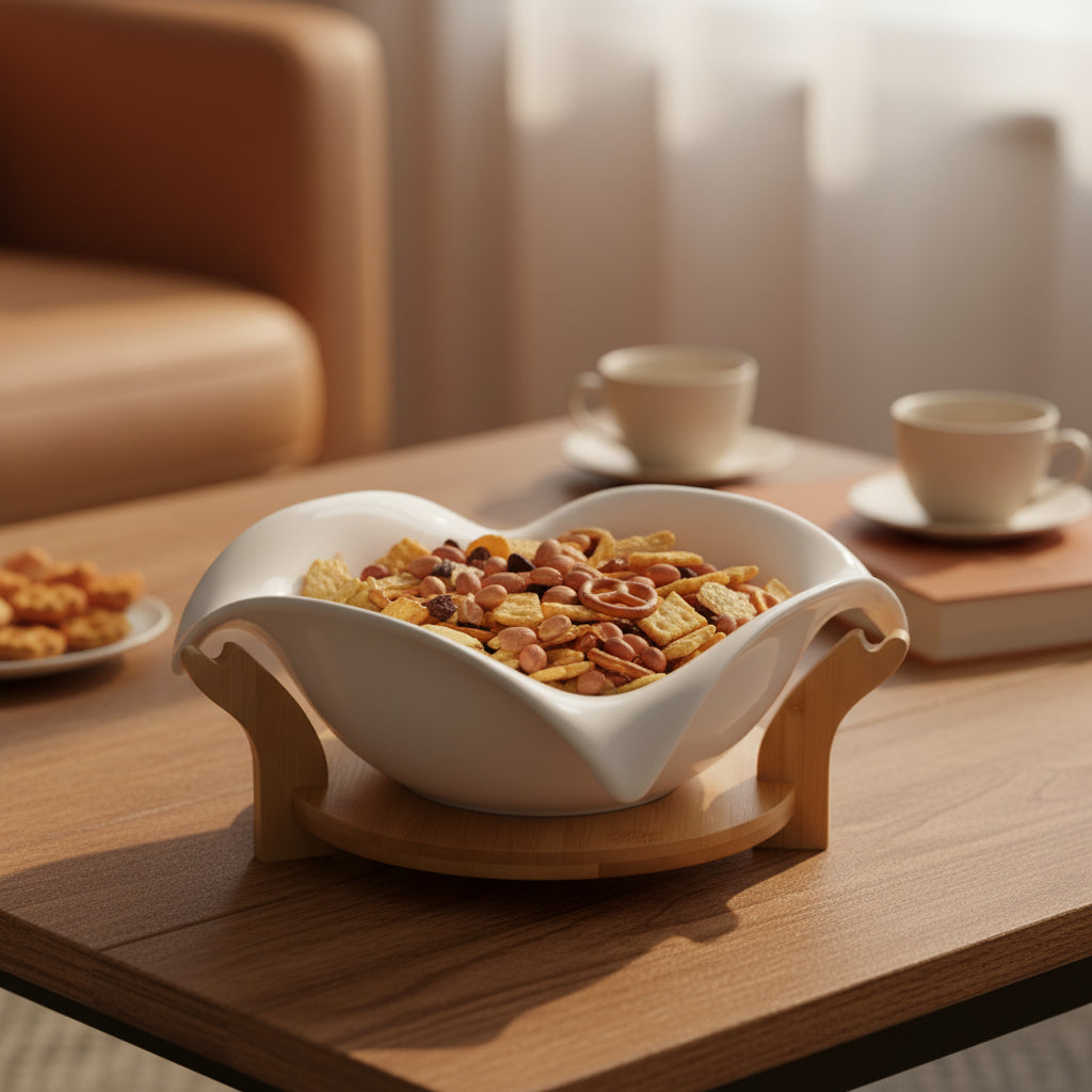 Elegant White Ceramic Leaf-Shaped Bowl with Wooden Stand – Decorative & Functional Serving Bowl