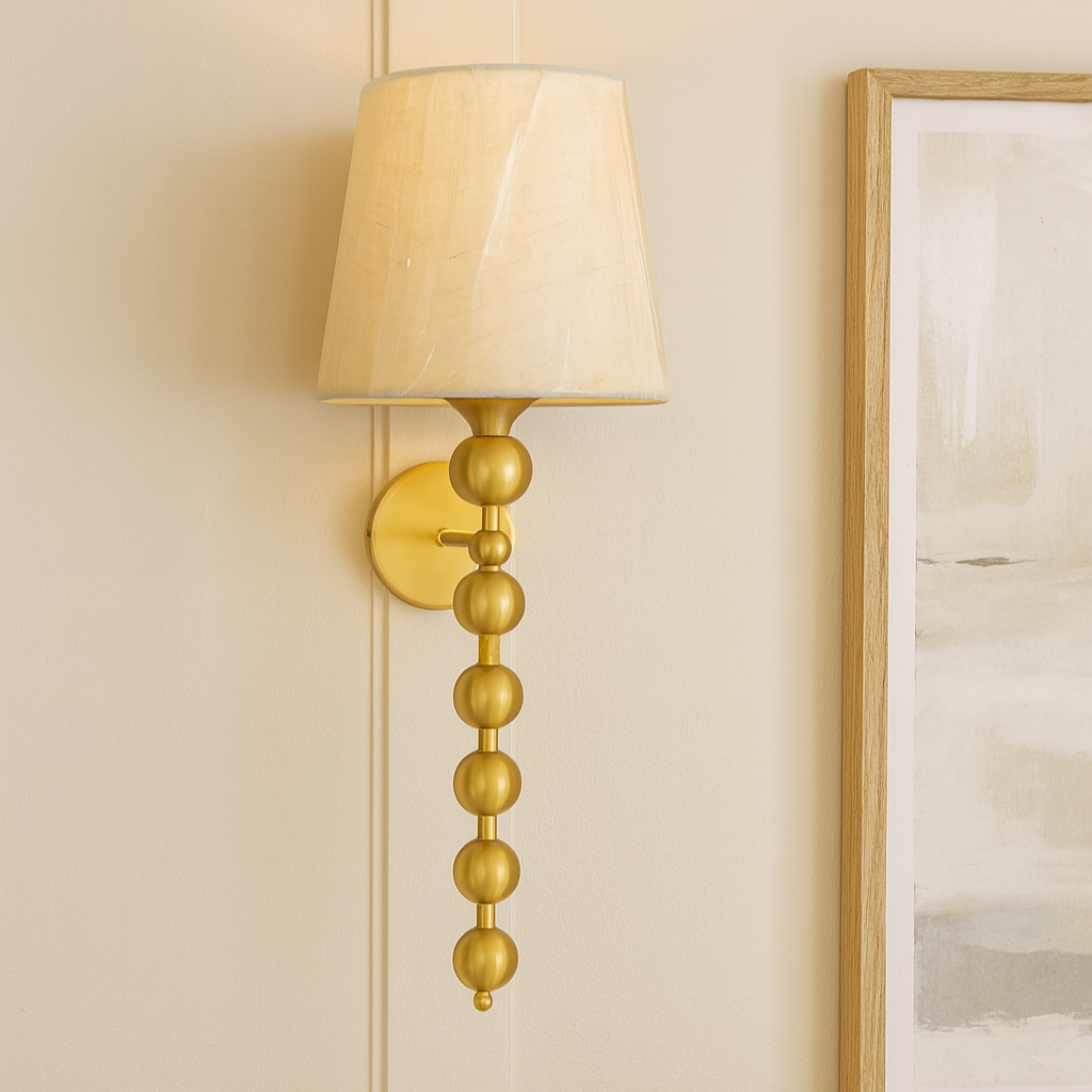 This elegant wall sconce blends timeless brass craftsmanship with modern sophistication. Its sleek stem, adorned with a series of graduated golden spheres, creates a balanced, sculptural look. The soft beige fabric lampshade diffuses light beautifully, adding a warm, inviting glow to any space. Perfect for bedrooms, living rooms, or hallways, it serves as both a functional light and a decorative accent.
