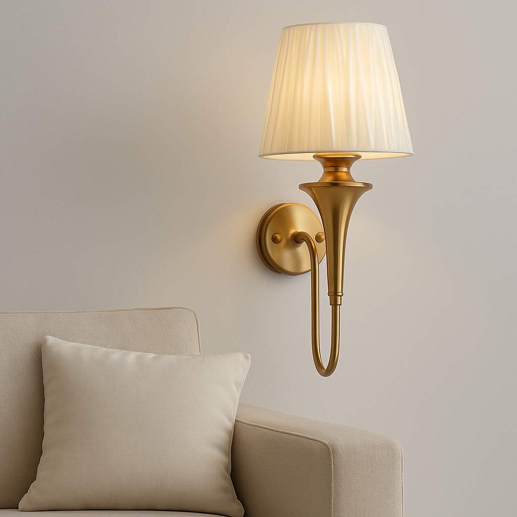 Golden Wall Mounted Lamp with Fabric Shade – Classic Brass Finish