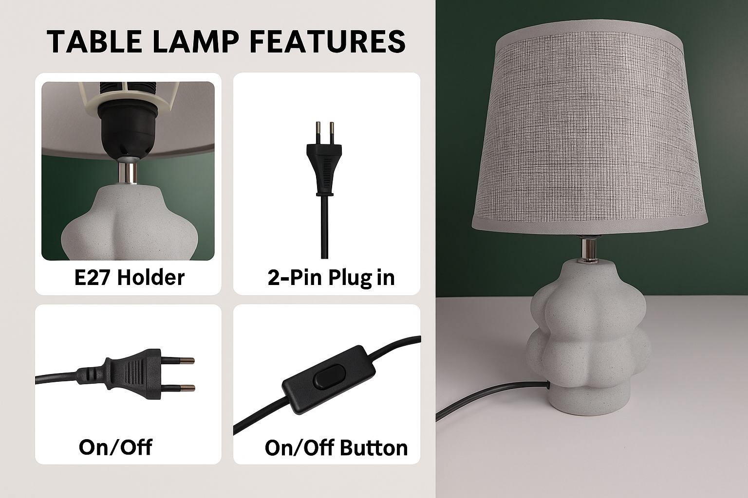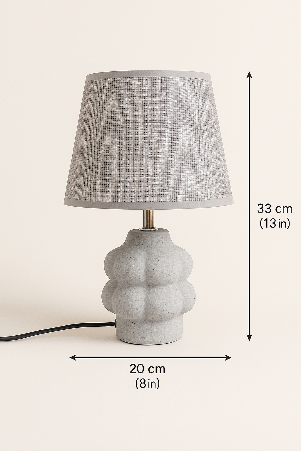 • Contemporary Sculptural Design – A uniquely shaped lamp featuring a modern bubble-style base with a smooth concrete finish, adding character and sophistication to any room.