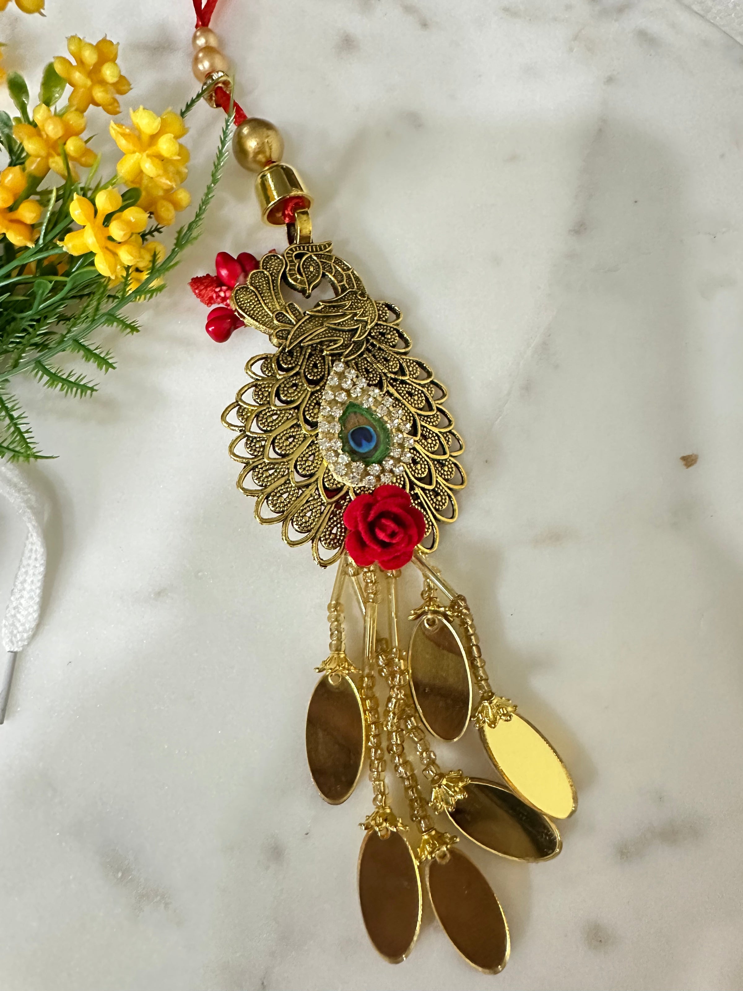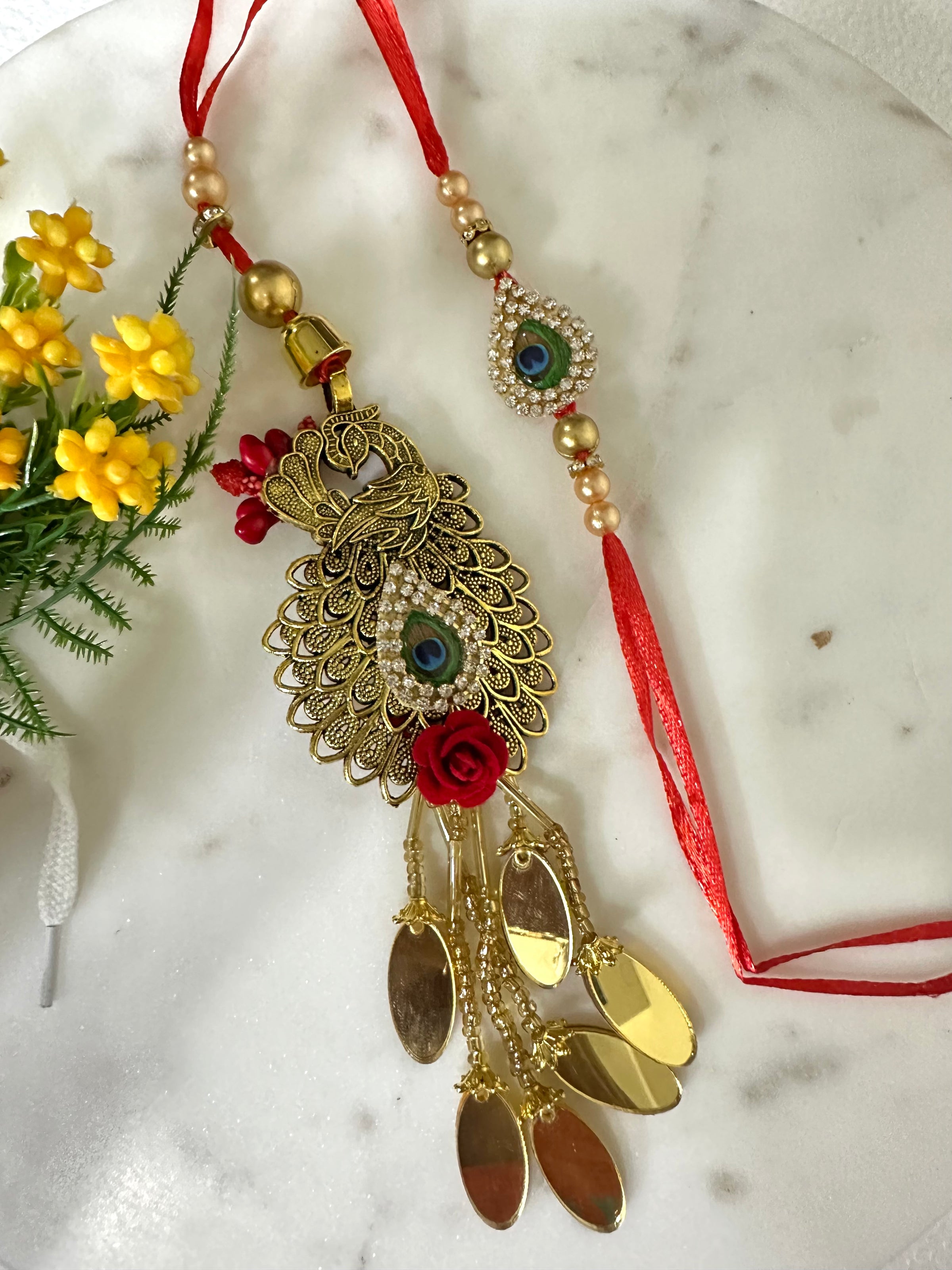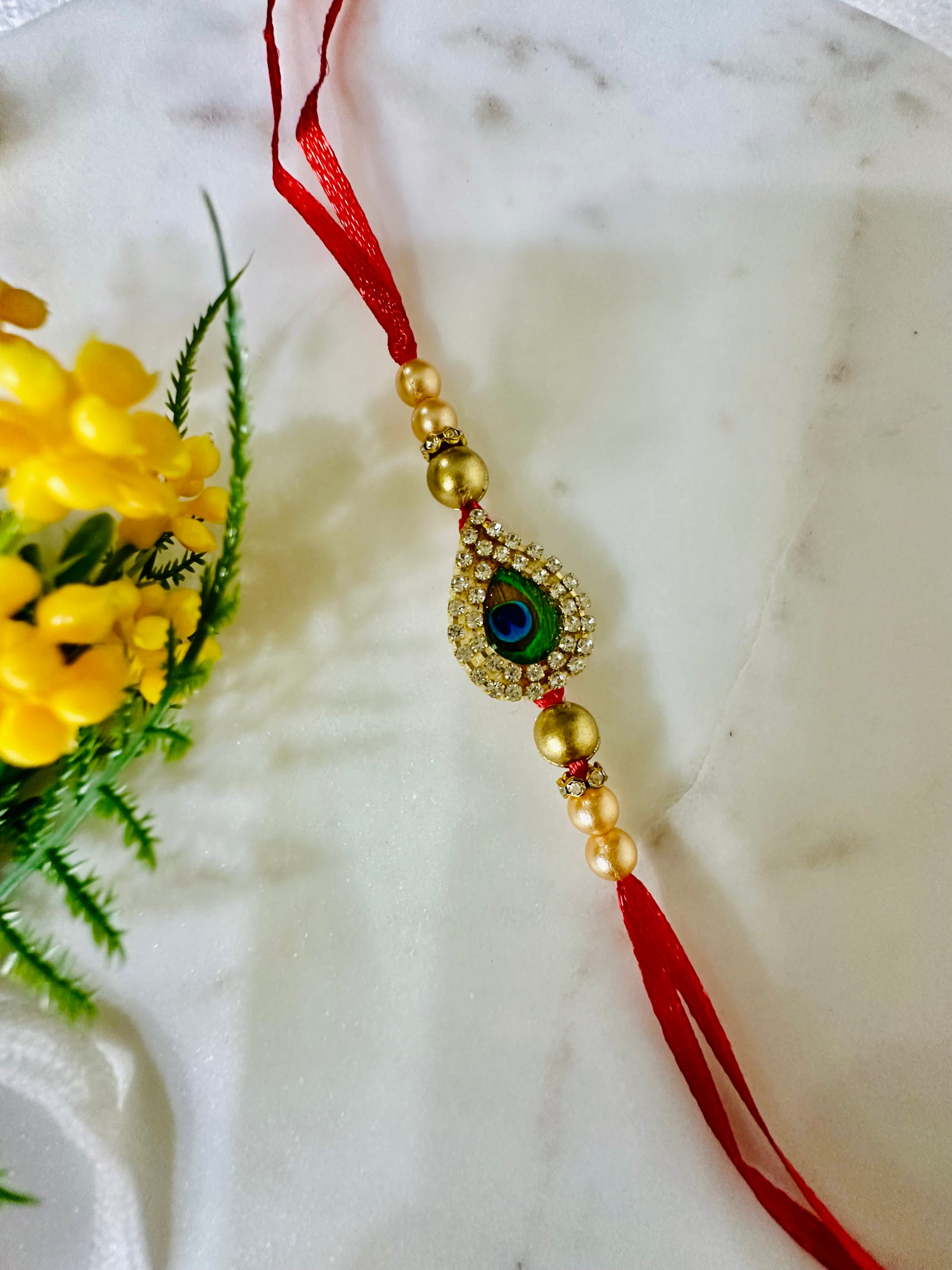 “With royal hues and divine charm, this Rakhi celebrates love and elegance.”
